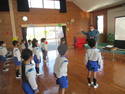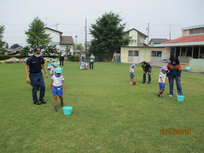 6月26日に、袋井消防署浅羽分署の消防士の方が浅羽西幼稚園に来園し、花火・防火教室を行ってくださいました。