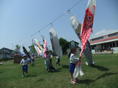 4月20日、こいのぼりが今年も園庭で、元気よく泳ぎ始めました。風に揺られておもしろそうに泳いでいるこいのぼりを、歓声を上げながら喜んで追いかけている子どもたち。みんな元気に育つことでしょう。