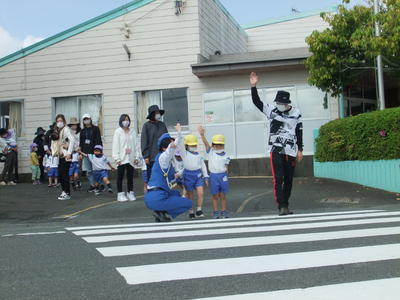 4月25日(月)、交通指導員、交通安全指導員の皆様を講師にお迎えし、交通安全教室を開きました。遊戯室で交通指導員さんから「交通ルール」について学んだ後、園の周りの公道に出て、信号機のある横断歩道やない横断歩道の渡り方などを体験しました。これからも交通安全には十分に気を付けましょうね。なお、歩行訓練に参加してくださった保護者の皆様、ありがとうございました。