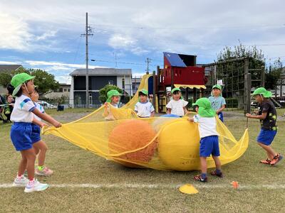 年長8人で力を合わせ、手押し車やネット、棒などを使って3個の大玉を運びました。