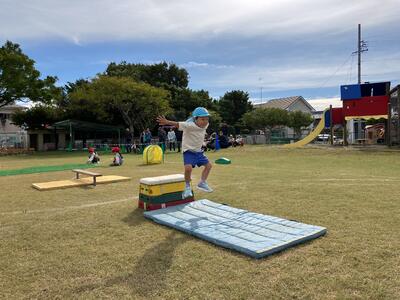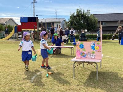 年少、年中さんは様々なコースを乗り越え、大好きなカタツムリに餌をあげてゴールです。